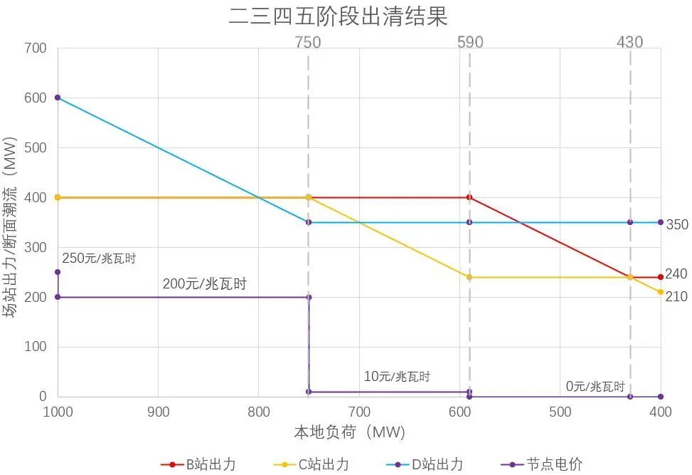 b)二三四五階段(本地負荷由1000兆瓦降至400兆瓦)出清結(jié)果