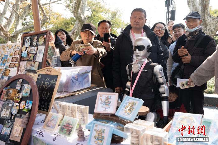 浙江杭州,人形機器人“小楊”在西湖畔的市集銷售崗位亮相。(資料圖)吳君毅攝