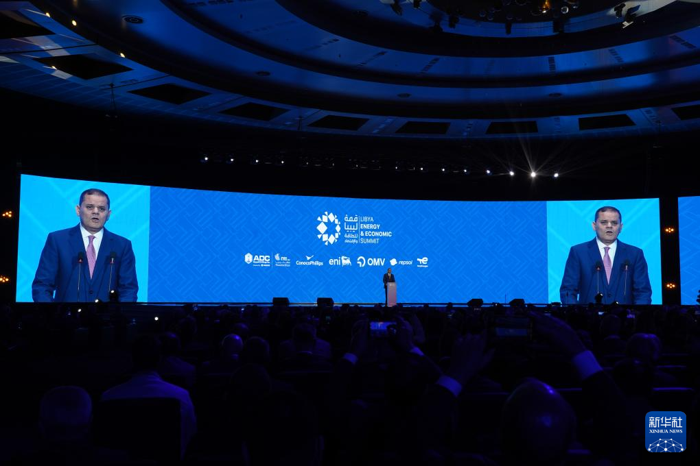 這是1月24日在利比亞首都的黎波里拍攝的第四屆利比亞能源與經(jīng)濟(jì)峰會會場。新華社發(fā)(哈澤姆·圖爾基亞攝)