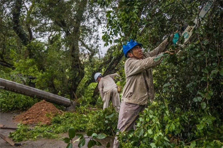 國網(wǎng)福建泉州惠安供電公司員工在被大風(fēng)壓斷的10千伏虎窟線電桿旁緊急清理樹木障礙。
