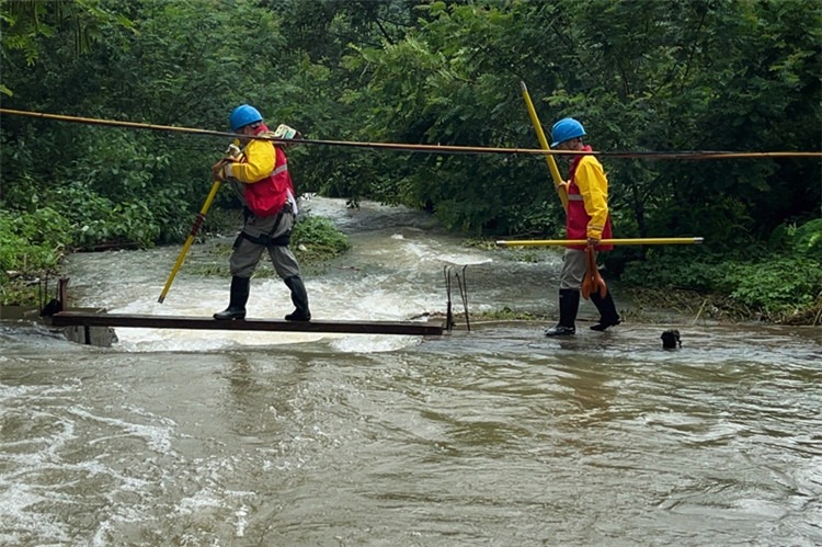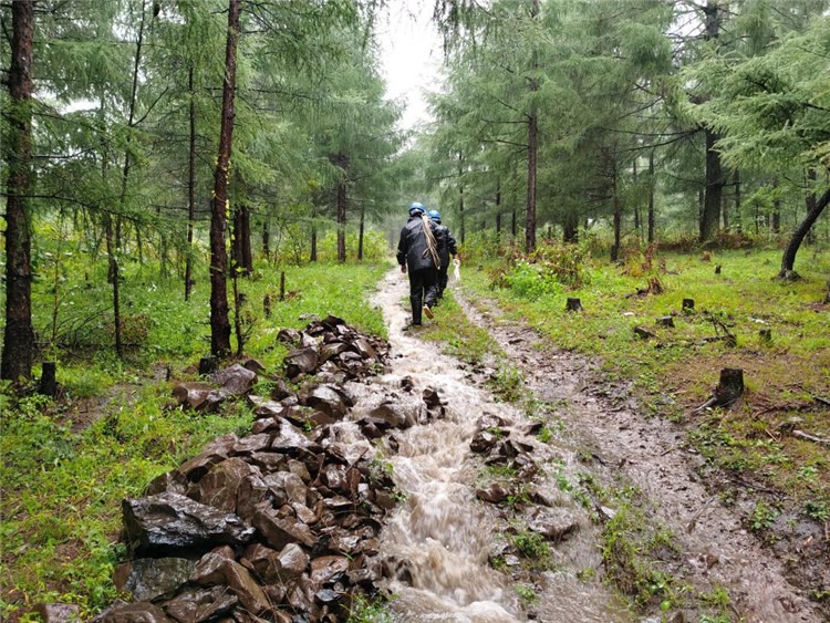 國網(wǎng)吉林送變電公司員工冒雨巡護山區(qū)線路。