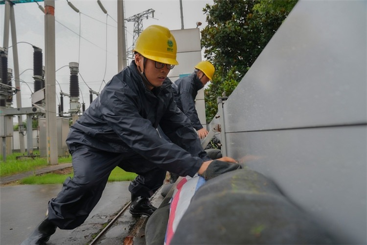 國網(wǎng)江蘇南通供電公司員工冒雨檢查閘口用電設(shè)備,確保安全運行。