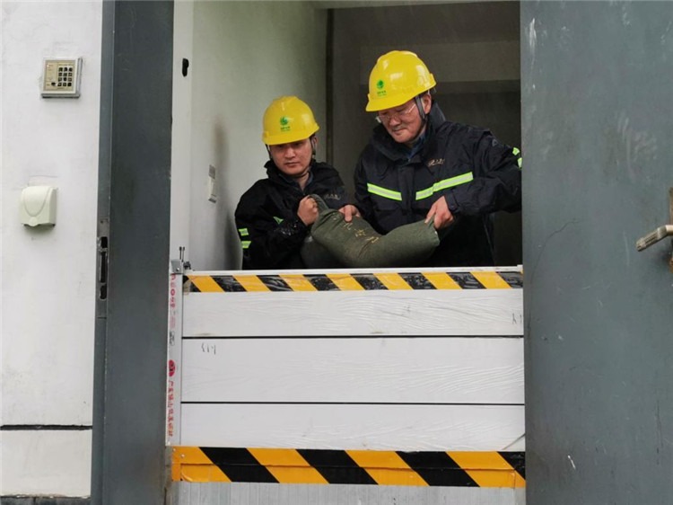 國網(wǎng)安徽安慶岳西縣供電公司員工裝沙袋加固城西變電站圍墻,防范臺風(fēng)影響變電站設(shè)備安全運行。