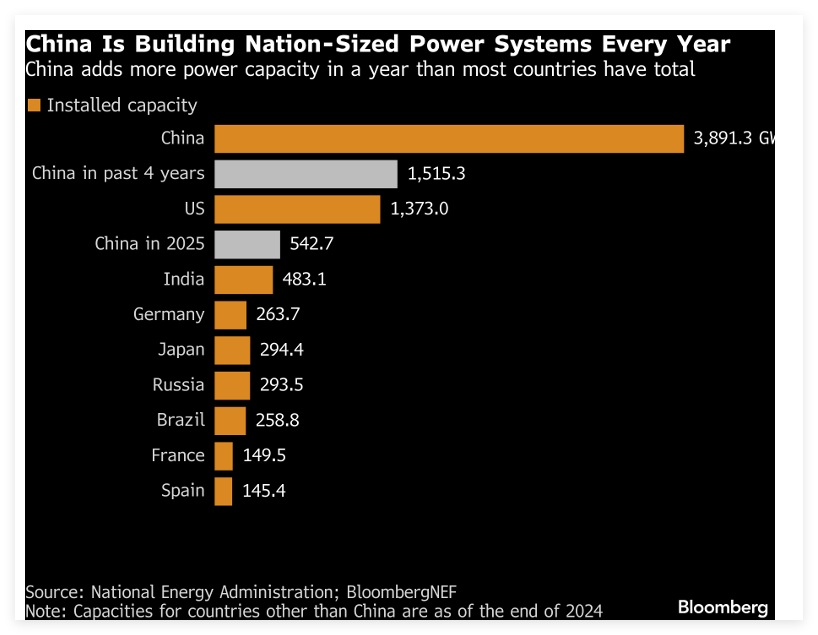 長(zhǎng)期密切關(guān)注中國(guó)能源市場(chǎng)的彭博社,在28日的最新報(bào)道中,用一張直觀的圖片清晰呈現(xiàn)了兩組數(shù)據(jù)的全球分量:中國(guó)截至2025年底達(dá)到38.9億千瓦的全國(guó)累計(jì)發(fā)電裝機(jī)容量,以及2025年一年新增的5.43億千瓦發(fā)電裝機(jī)容量。