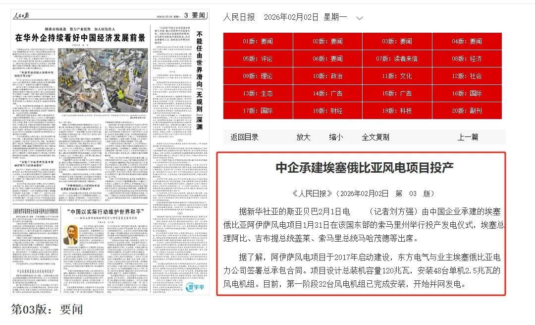 1月31日,由東方電氣集團(tuán)所屬東方國際承建的埃塞俄比亞最大風(fēng)電項目阿伊薩風(fēng)電項目舉行首期工程發(fā)電投產(chǎn)儀式。埃塞俄比亞總理阿比、吉布提總統(tǒng)蓋萊、索馬里總統(tǒng)馬哈茂德等出席。中國駐埃塞俄比亞大使館大使陳海、公使銜參贊劉曉光出席儀式。