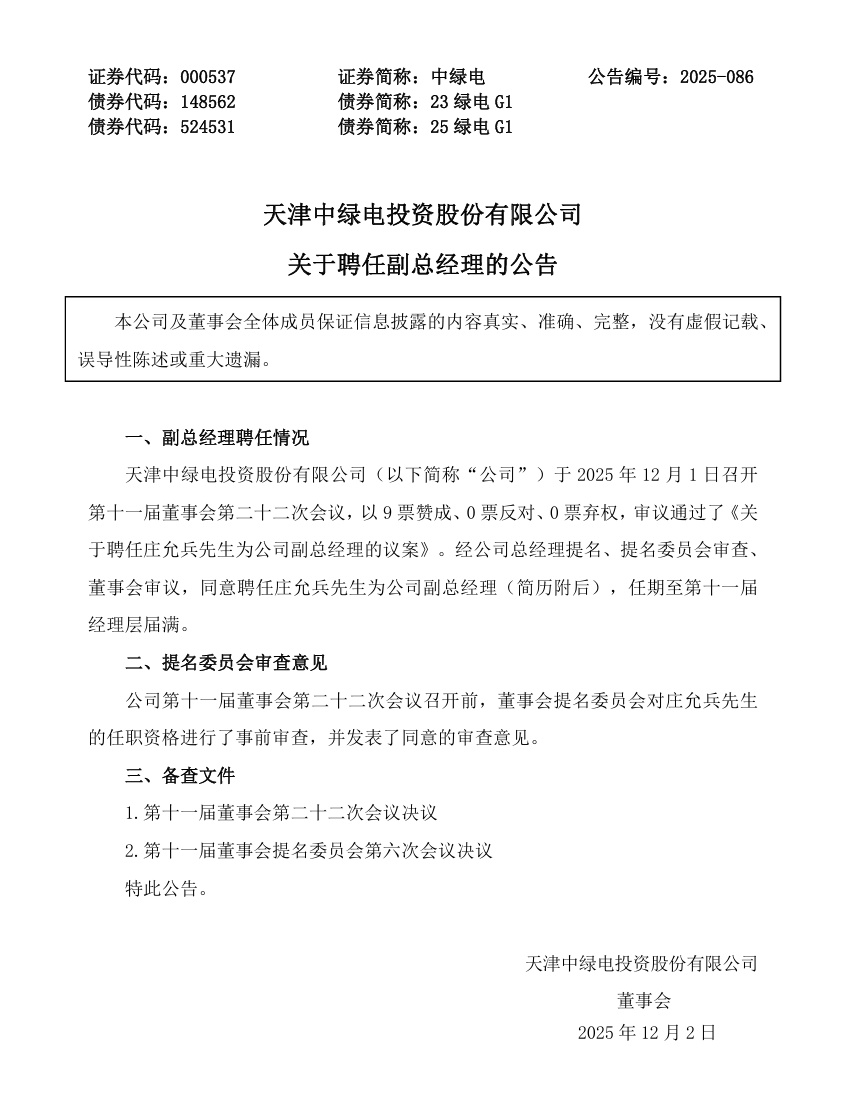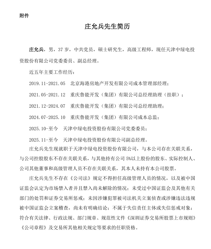 莊允兵任天津中綠電投資股份有限公司(以下簡稱“中綠電”)副總經(jīng)理。