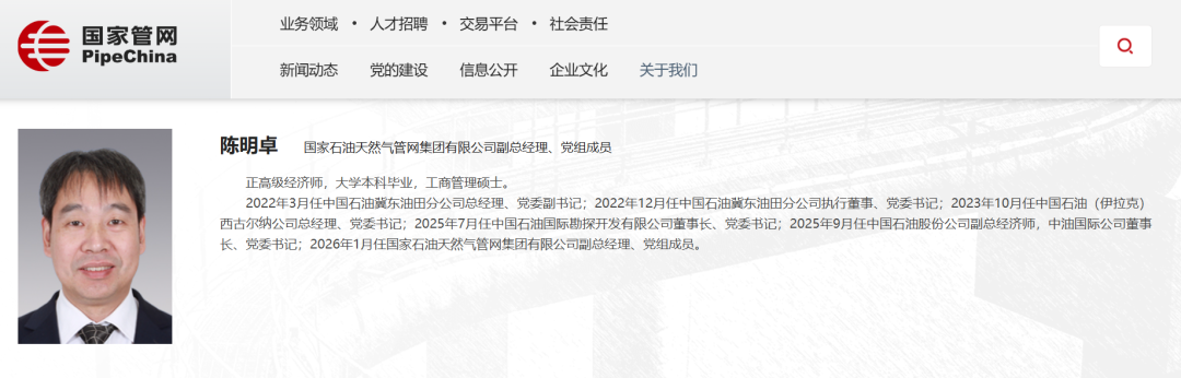 陳明卓,2022年3月任中國石油冀東油田分公司總經(jīng)理、黨委副書記;2022年12月任中國石油冀東油田分公司執(zhí)行董事、黨委書記;2023年10月任中國石油(伊拉克)西古爾納公司總經(jīng)理、黨委書記;2025年7月任中國石油國際勘探開發(fā)有限公司董事長、黨委書記;2025年9月任中國石油股份公司副總經(jīng)濟師,中油國際公司董事長、黨委書記;2026年1月任國家石油天然氣管網(wǎng)集團有限公司副總經(jīng)理、黨組成員。