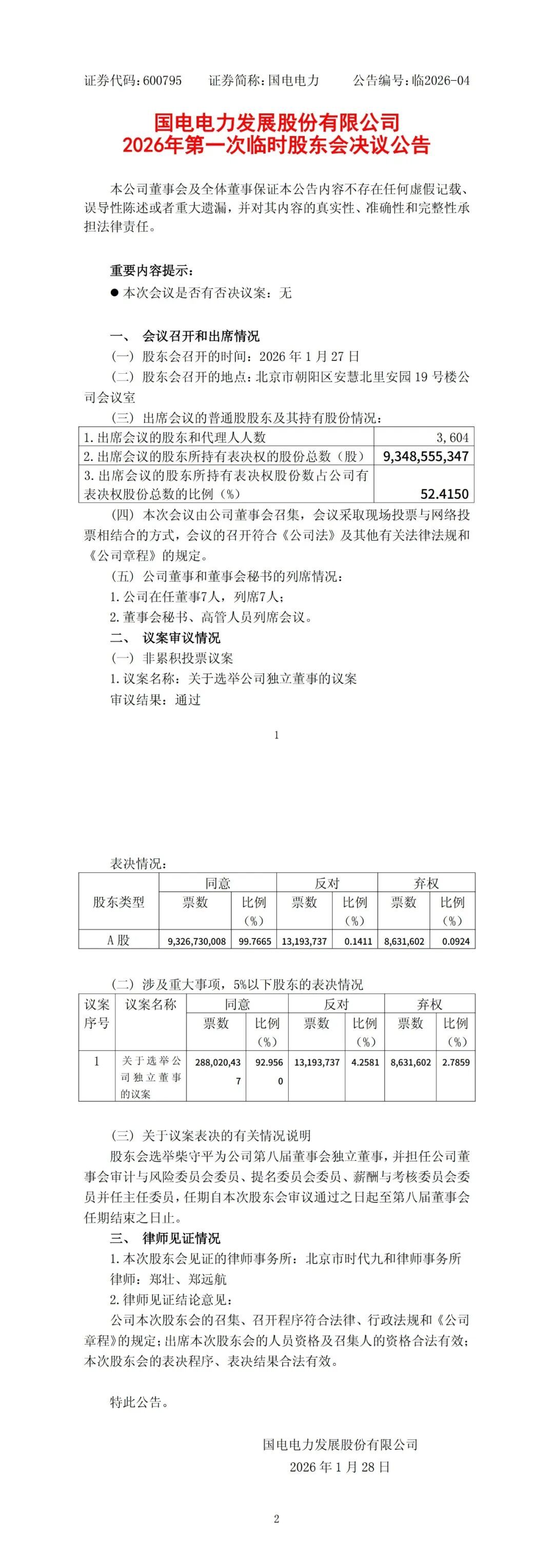 1月28日,國電電力發(fā)布公告稱,公司于2026年1月27日召開2026年第一次臨時股東會,股東會選舉柴守平為公司第八屆董事會獨立董事,并擔任公司董事會審計與風險委員會委員、提名委員會委員、薪酬與考核委員會委員并任主任委員,任期自本次股東會審議通過之日起至第八屆董事會任期結束之日止。