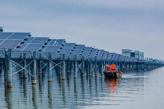 泰瀚550兆瓦漁光互補(bǔ)項(xiàng)目坐落于溫州浙南產(chǎn)業(yè)集聚區(qū)甌飛圍區(qū)內(nèi)的灘涂上,總裝機(jī)容量550兆瓦,占水域面積約4.7平方公里。工程共安裝142.8萬(wàn)片光伏組件,排列組成24個(gè)區(qū)塊進(jìn)行發(fā)電。項(xiàng)目將漁業(yè)養(yǎng)殖和光伏發(fā)電相結(jié)合,“上可發(fā)電、下可養(yǎng)魚”,集約用海變成現(xiàn)實(shí)。
