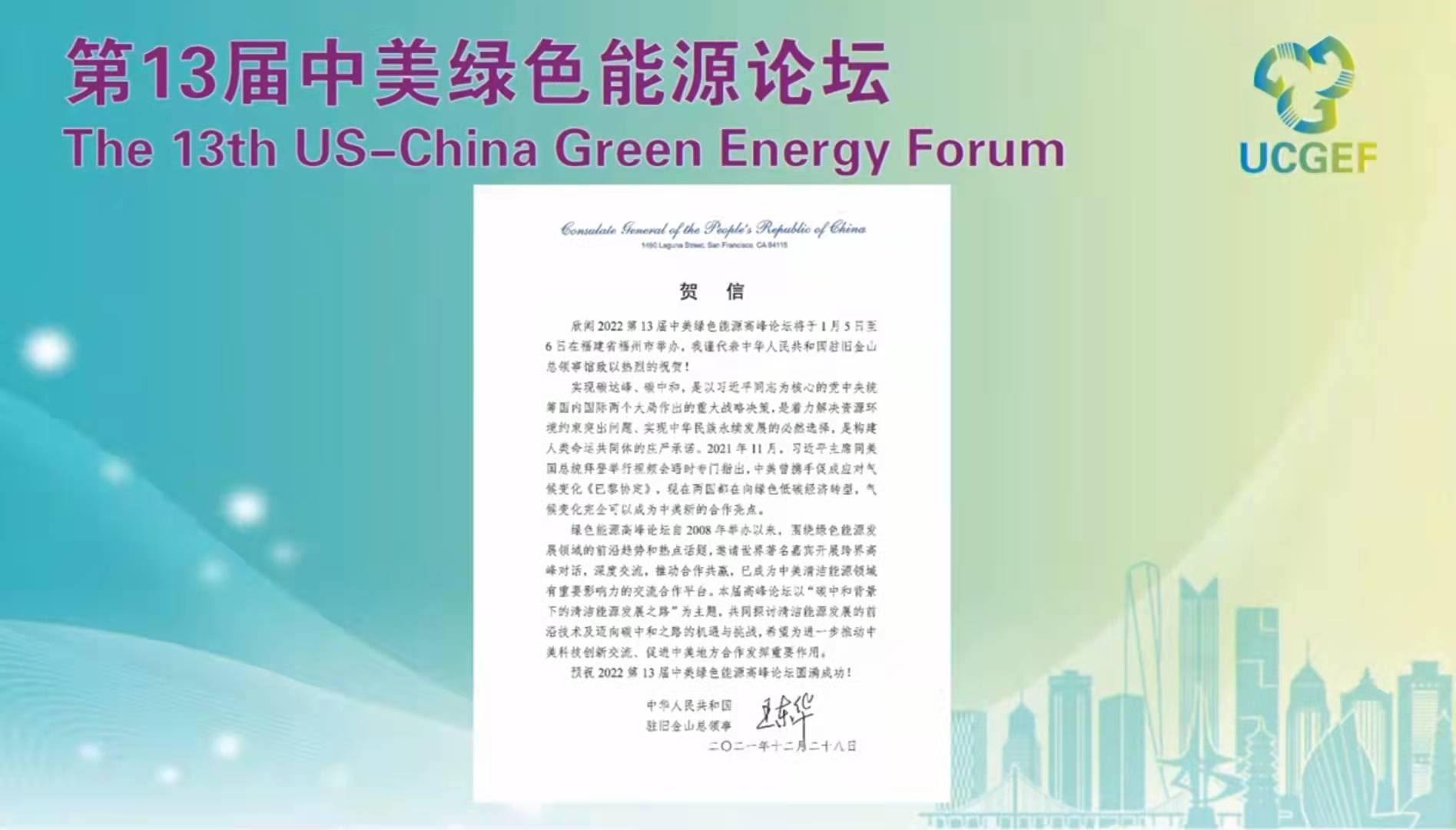 中華人民共和國駐舊金山總領事館的賀信中指出,中美曾攜手促成應對氣候變化《巴黎協(xié)定》,現(xiàn)在兩國都在向綠色低碳經(jīng)濟轉(zhuǎn)型,應對氣候變化完全可以成為中美新的合作亮點。中美綠色能源論壇自創(chuàng)辦以來,圍繞綠色能源發(fā)展領域的前沿趨勢和熱點話題,邀請世界著名嘉賓開展跨界高峰對話,深度交流,推動合作共贏,已成為中美清潔能源領域具有重要影響力的交流合作平臺。希望為進一步推動中美科技創(chuàng)新交流、促進中美地方合作發(fā)揮重要作用。