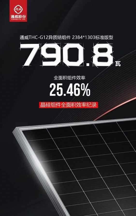HJT技術方面,經國際權威認證機構TüV測試,通威2384*1303mm標準組件尺寸THC-G12異質結組件最高功率達到790.8W,全面積組件效率達到25.46%,創(chuàng)權威第三方測試晶硅組件全面積效率的最高值。