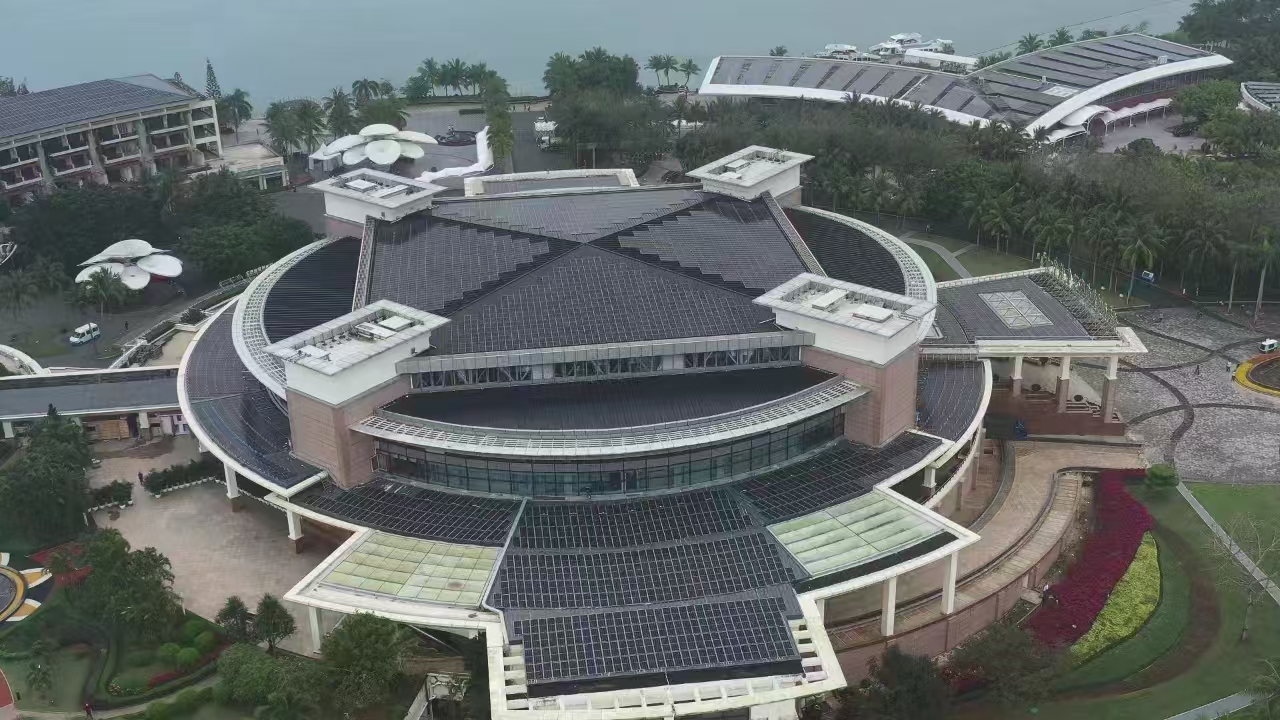 博鰲亞洲論壇首次實(shí)現(xiàn)全場管場館綠電自給自足。圖為主場館屋頂?shù)墓夥O(shè)備。宋印官 攝