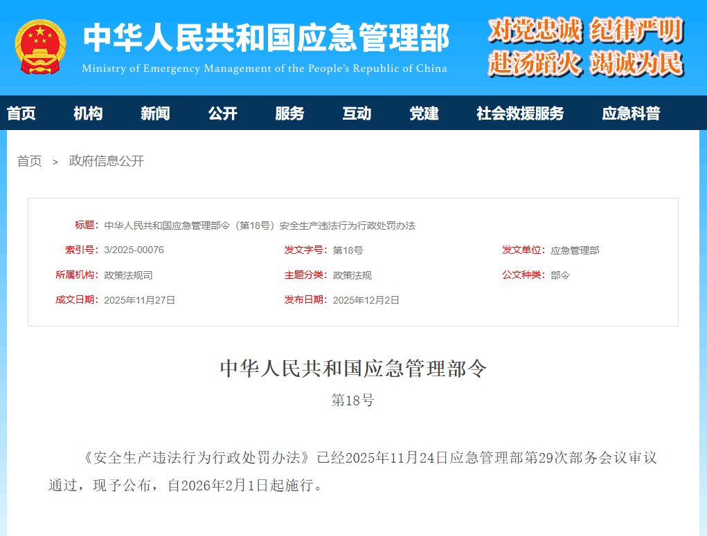 《安全生產(chǎn)違法行為行政處罰辦法》已經(jīng)2025年11月24日應(yīng)急管理部第29次部務(wù)會議審議通過,現(xiàn)予公布,自2026年2月1日起施行。