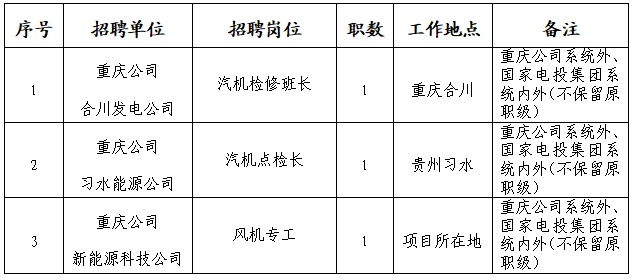 按照員工招聘有關(guān)規(guī)定,重慶公司所屬相關(guān)單位面向國家電投集團(tuán)系統(tǒng)內(nèi)外公開招聘,具體事項(xiàng)如下: