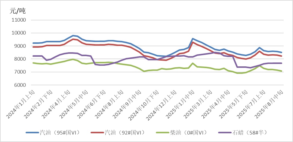 8月中旬,IEA上調(diào)全球石油供應(yīng)過剩預(yù)期,美國能源信息署(EIA)預(yù)測2025年美國原油日產(chǎn)量將創(chuàng)1341萬桶紀(jì)錄,夏季駕駛旺季臨近尾聲原油需求下降預(yù)期增強,中美關(guān)稅暫停措施再延長90天等因素推動國際油價延續(xù)下跌態(tài)勢。然而,市場對美聯(lián)儲9月降息的預(yù)期增強,阿拉斯加美俄峰會并未取得實質(zhì)性進展,俄烏局勢不確定性推升地緣風(fēng)險溢價,受上述因素影響,國際油價跌幅有所收窄。