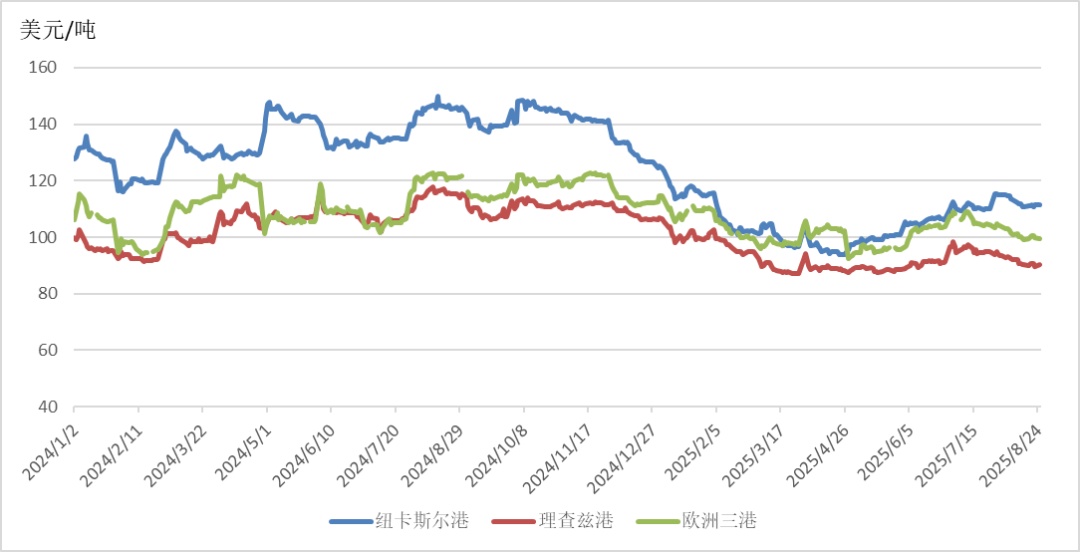 截至8月25日,澳大利亞紐卡斯?fàn)柛勖禾科谪泝r格報收于111.3美元/噸,月環(huán)比上漲1.00%,相較2024年同期的145.7美元/噸,下降23.61%;南非理查茲港煤炭期貨價格報收于90.2美元/噸,月環(huán)比下降4.85%,相較2024年同期的115.4美元/噸,下降21.84%;歐洲三港煤炭期貨價格報收于99.5美元/噸,月環(huán)比下降4.70%,相較2024年同期的121.15美元/噸,下降17.87%。