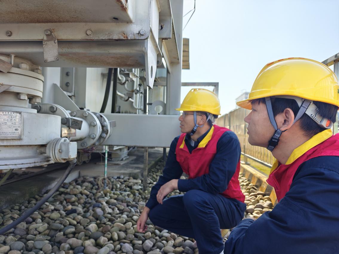 團(tuán)林換流站運維人員符貴軍和別征宇密切監(jiān)視閥門漏油態(tài)勢。余有為 攝