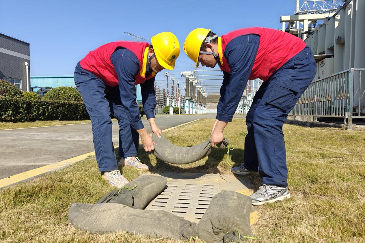 團(tuán)林換流站運維人員符貴軍和別征宇搬運沙袋封堵排污口。余有為 攝