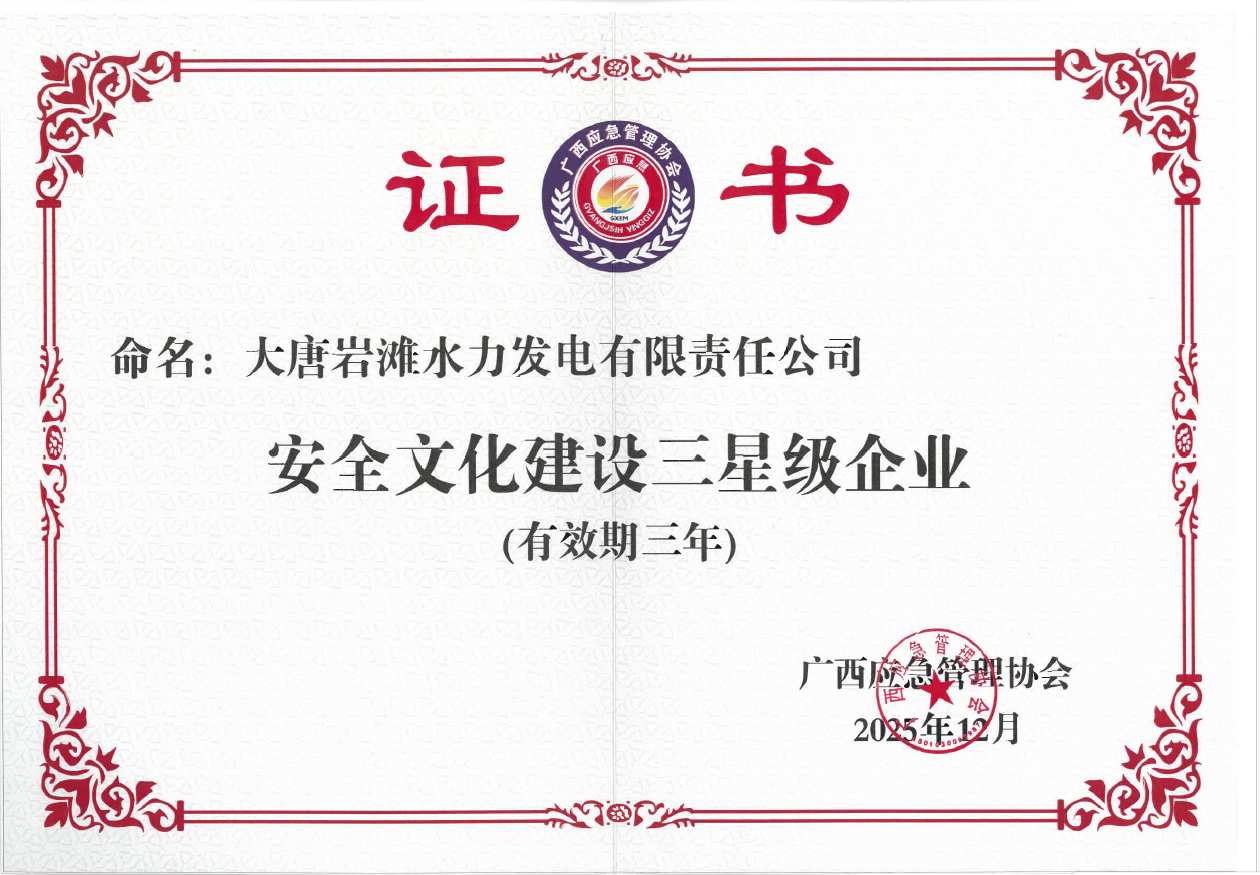2025年1月9日,大唐巖灘水力發(fā)電有限責(zé)任公司(簡稱“巖灘水電公司”)捧回了榮譽證書。憑借扎實過硬的安全管理成效,經(jīng)廣西應(yīng)急管理協(xié)會嚴(yán)格評審,該公司正式被命名為“安全文化建設(shè)三星級企業(yè)”,躋身廣西首批獲此殊榮的水電企業(yè)。