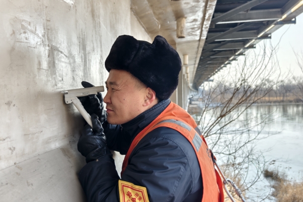 劉海霖和侯桂興分頭檢查,他們逐一復(fù)核螺栓,扳手一扣一松,確認(rèn)緊固狀態(tài)。對伸縮裝置邊緣結(jié)冰的部位,他們先清理再檢查??吹交炷帘砻嬗幸伤屏芽p處,他們就用刻度放大鏡貼上去一點(diǎn)點(diǎn)比對,把寬度、走向、變化趨勢都要記錄清楚。